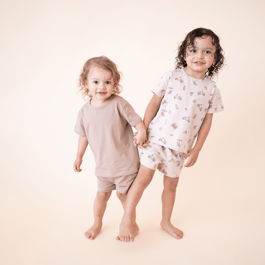 Our Organic Cotton Short Set in Summer Vibes is the perfect blend of comfort and playfulness. Made from soft, breathable 95% organic cotton with a hint of stretch, this set features a slightly oversized tee and elastic-waist shorts with functional pockets. The retro-inspired Summer Vibes print brings seaside charm to sunny day adventures, keeping little ones cool, comfy, and stylish all day long.